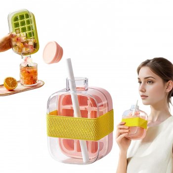 2-in-1 Ice Cube Tray and Water Bottle with Straw and Easy Press Release
